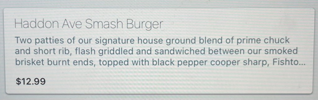 This burger needs no hyperbole whatsoever but hyperbole is kind of my thing so I’m going to do it anyway. The flavor of the Haddon Ave Smash Burger is that of the unrealized kiss from your high school crush. The aroma is the mildly sweet comfort of perfume left traced on your mother’s sweater as she hugs you tight, just when you needed it the most. It leaves you satisfied in the vein of finishing your first novel, or dunking a basketball for the first time.
